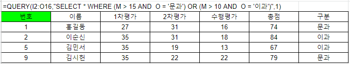 =QUERY(I2:O16,"SELECT * WHERE (M > 15 AND O = '문과') OR (M > 10 AND O = '이과')",1)