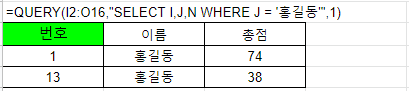=QUERY(I2:O16,"SELECT I,J,N WHERE J = '홍길동'",1)
