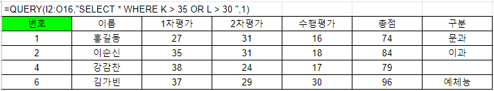 6-1. 1차평가 점수(K)가 35점 이상이거나 또는 2차 평가 점수(L)가 30점 이상인 학생만 가져오기