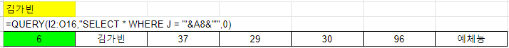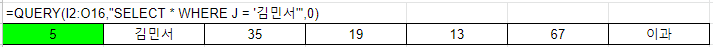 =QUERY(I2:O16, "SELECT * WHERE J = '김민서'" , 0)