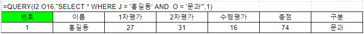 =QUERY(I2:O16,"SELECT * WHERE J = '홍길동' AND O = '문과'",1)