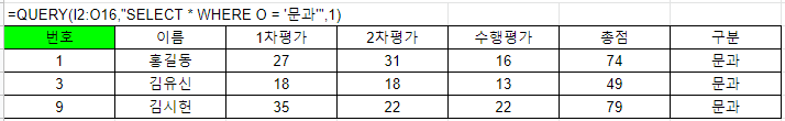 =QUERY(I2:O16,"SELECT * WHERE O = '문과'",1)