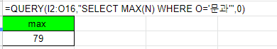 =QUERY(I2:O16,"SELECT MAX(N) WHERE O='문과'",0)