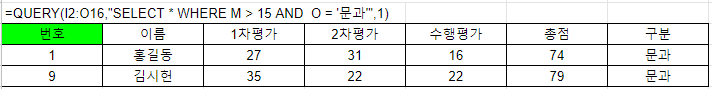 =QUERY(I2:O16,"SELECT * WHERE M > 15 AND O = '문과'",1)
