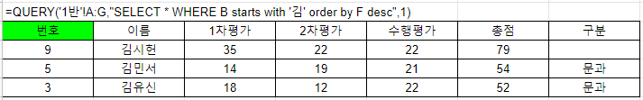 =QUERY('1반'!A:G,"SELECT * WHERE B starts with '김' order by F desc",1)
