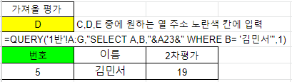 =QUERY('1반'!A:G,"SELECT A,B,"&A23&" WHERE B= '김민서'",1)