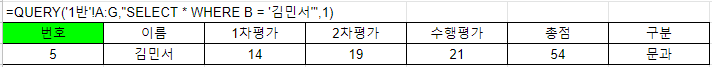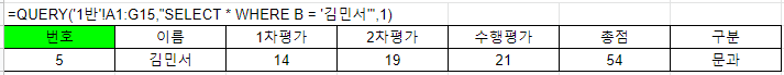 =QUERY('1반'!A1:G15,"SELECT * WHERE B = '김민서'",1)