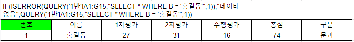 =IF(ISERROR(QUERY('1반'!A1:G15,"SELECT * WHERE B = '금길동'",0)),"데이타 없음",QUERY('1반'!A1:G15,"SELECT * WHERE B = '금길동'",0))