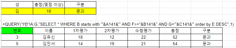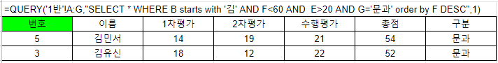 =QUERY('1반'!A:G,"SELECT * WHERE B starts with '김' AND F<60 AND E>20 AND G='문과' order by F DESC",1)