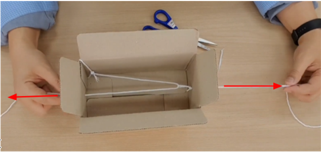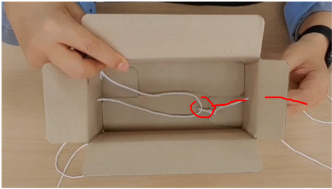 택배박스를 이동하지 못하게 고정시켜 놓고 아래쪽 줄을 잡아 당기면 반대쪽 줄이 잡아당긴 길이 만큼 올라간다. 고정도르래와 같은 원리가된다.