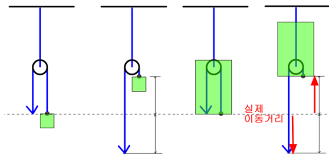 아래쪽 줄을 잡아 당기면 위에 있는 줄(고정도르래)을 중심으로 잡아 당긴 만큼 반대쪽 줄이 택배박스를 끌고 올라간다. 고정도르래 원리와 같기 때문에 잡아당긴 줄의 길이 만큼 반대쪽 물체가 따라 올라가야 하는데, 언뜻 보면 잡아당긴 줄 길이의 절반만큼 택배박스가 끌려 올라가는 것처럼 보인다. 왜 그럴까?
