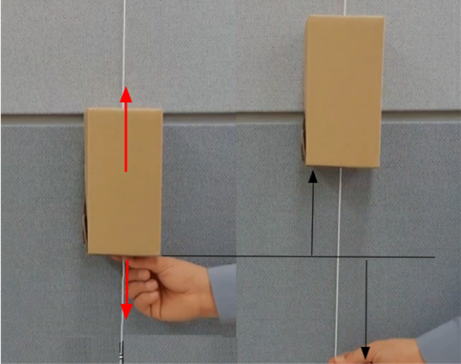 이는 기준점을 제대로 잡지 않아서 생기는 착각이다. 처음위치를 표시하고, 나중위치를 비교하면 잡아당긴 줄의 길이 만큼 택배박스가 올라갔다는 걸 알 수 있다.