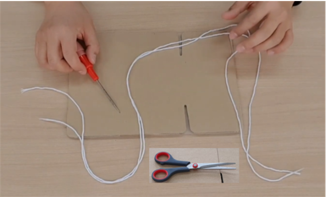 다. 위쪽 구멍에 실을 통과시키고, 아래쪽 줄이 잘 지나다닐 수 있도록 고리 모양으로 묶어 준다. 고리 모양을 만들 때 아래쪽 줄을 통과시킨 상태에서 만들어야 한다. (실제 원형 고리를 이용해서 만들어도 좋다.)