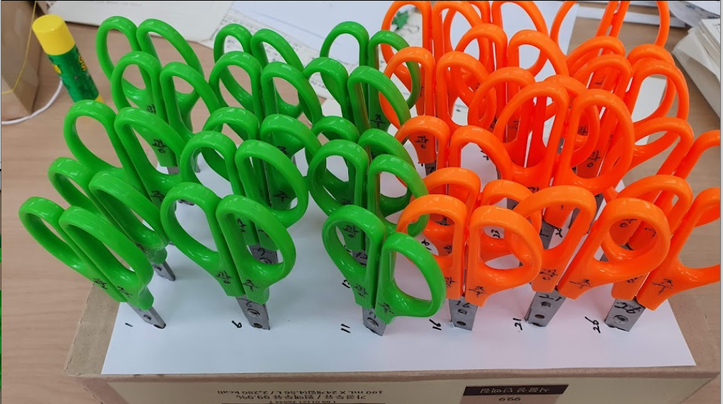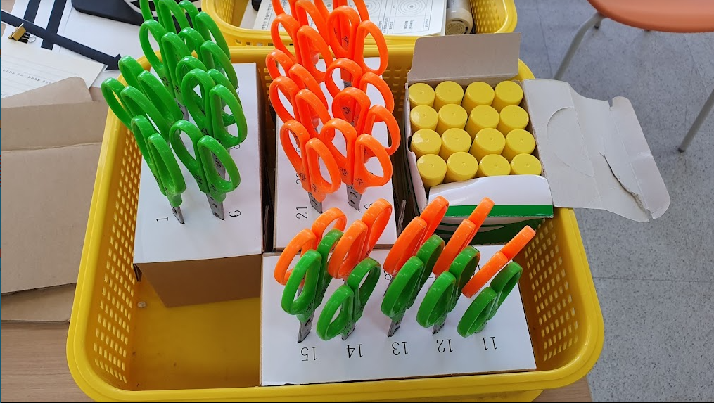학생들은 자신의 번호에 맞는 가위를 가져다 사용하고 돌려 놓면 된다. 10개씩 보관하기 때문에 적당하게 거리를 벌려 두면, 쉽게 가위를 가져다 사용할 수 있다. 또 번호가 적혀 있기 때문에 활동이 끝날 때 누가 반납하지 앉았는지도 바로 확인할 수 있다.