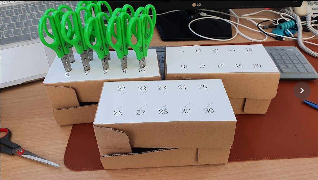 그래서 택배박스를 이용한 가위 보관함을 만들어 보았다. 처음에는 큰 택배박스에 30개의 가위를 보관했지만, 학생들이 각자 나와서 가져가거나 제자리 돌려 놓을 때 혼잡스러울 때가 있어서, 10개씩 보관하는 가위 보관함을 만들었다. 수업시간 사용해 보니, 생각보다 마음에 든다. 그래서 공개한다.