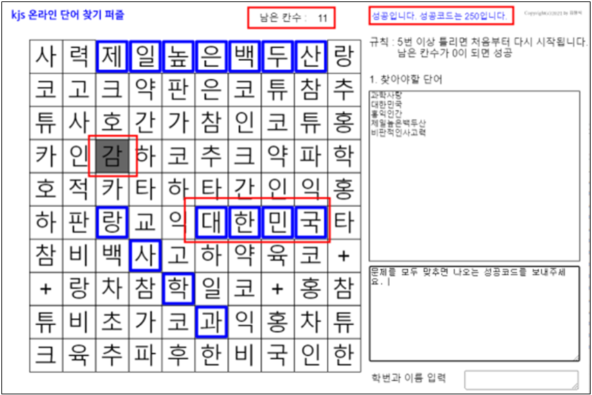 맞는 칸을 누르면 우측상단에 남은 칸수가 줄어드는 걸 볼 수 있다. 남은 칸수가 0이 되면 성공했다는 메시지가 뜨고, 그 옆에 파란색으로 성공코드가 나온다. 제대로 풀었는지 간단하게 확인하는 방법은 성공코드를 보내게 하면 된다.
