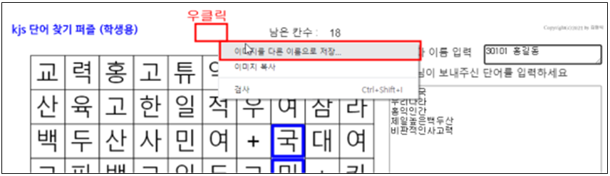 만약 좀 더 구체적으로 확인하고 싶다면 화면을 저장해서 그림파일을 보내게 하면 된다. 크롬에서는 화면위에서 마우스 오른쪽을 눌러 이미지를 다른이름으로 저장을 누르면 바로 그림파일로 저장할 수 있다. 스마트폰의 경우에는 화면을 캡처해서 보내면 된다. 이때는 학번과 이름입력 칸에 본인 학번과 이름을 적게 해서 화면 저장해서 보내게 하면 좋다.