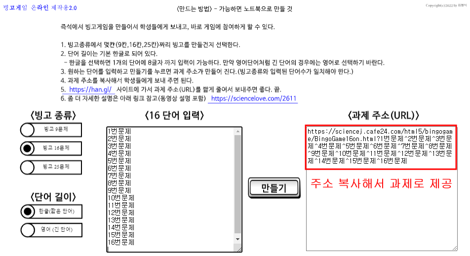 빙고종류를 고르고 단어길이를 선택하고(단어길이는 한글의 경우 8글자까지 입력가능, 영어를 선택하면 더 긴 단어도 가능하다.) 원하는 단어를 입력하고 만들기를 눌러 생기는 주소를 복사해서 학생들에게 보내주면 된다.