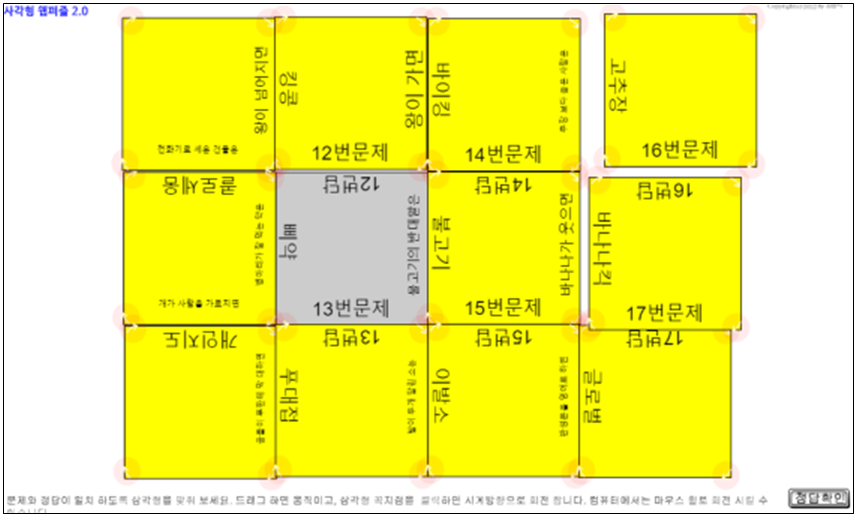 우측아래 정답확인 버튼을 누르면 몇개를 맞췄는지 알 수 있다. 총 10개의 삼각형 중에 가운데 움직이지 않는 삼각형은 이미 맞춰져 있다. 나머지만 맞추면 된다. 문제를 다 해결 했으면, 11문제의 문제와 답을 아래한글 표에다 순서대로 적어서 과제로 제출해라, 또는 성공화면을 캡쳐 해서 과제로 제출해라.
