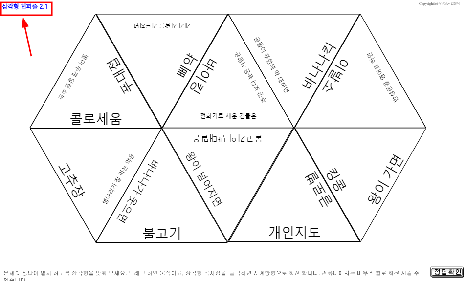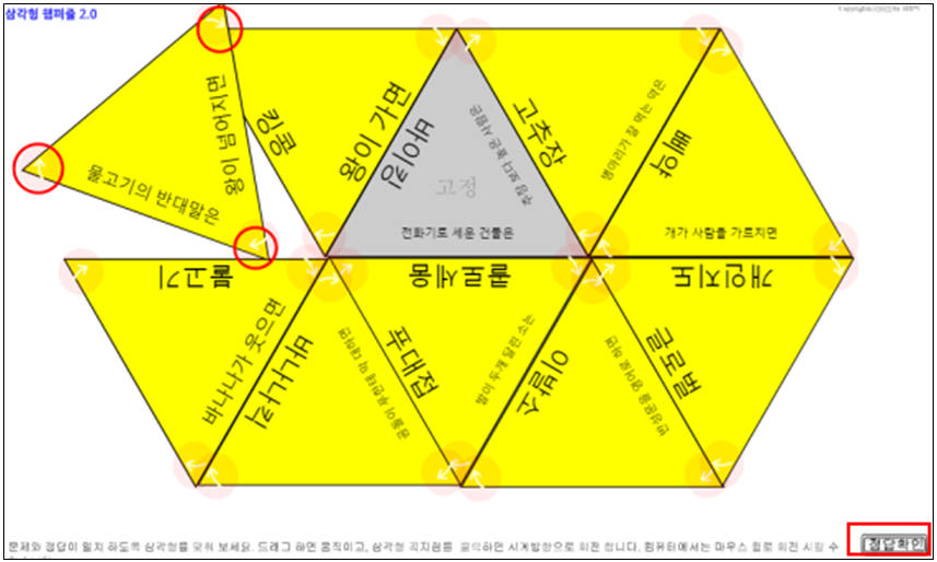 나. 실행시키고, 삼각형을 움직여 문제와 답을 일치시키면 된다. 단 회색으로 된 기준 삼각형은 움직일 수 없다. 삼각형은 마우스 가운데 스크롤로 회전시킬 수 있다. 스마트폰의 경우에는 삼각형 꼭지점에 있는 희미한 화살표가 그려진 원을 누르면 회전이 된다. 다 맞췄다고 생각되면 우측아래 정답확인을 눌러 몇문제를 제대로 맞췄는지 확인할 수 있다.