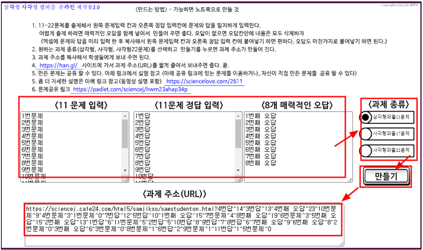 이곳에 있는 것보다 아래 링크에 있는 삼각형 사각형 웹용 직소퍼즐 만들기2.0(통합버전) 을 사용하세요. 훨씬 간단하게 문제를 만들어 학생들에게 제공할 수 있습니다. https://sciencelove.com/2612 ----