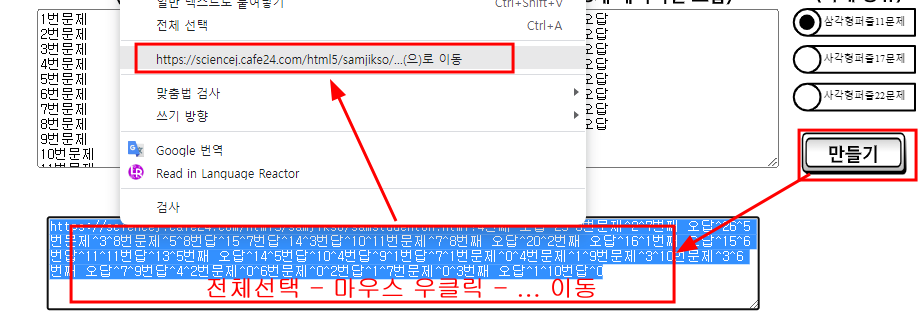 라. 학생들에게 보내기전에 미리 확인하고 싶으면 생성된 주소를 전체선택하고 마우스 우클릭해서 생기는 서브메뉴에서 .... 로 이동을 선택하면 만들어진 학생용 퍼즐을 미리 확인할 수 있다.