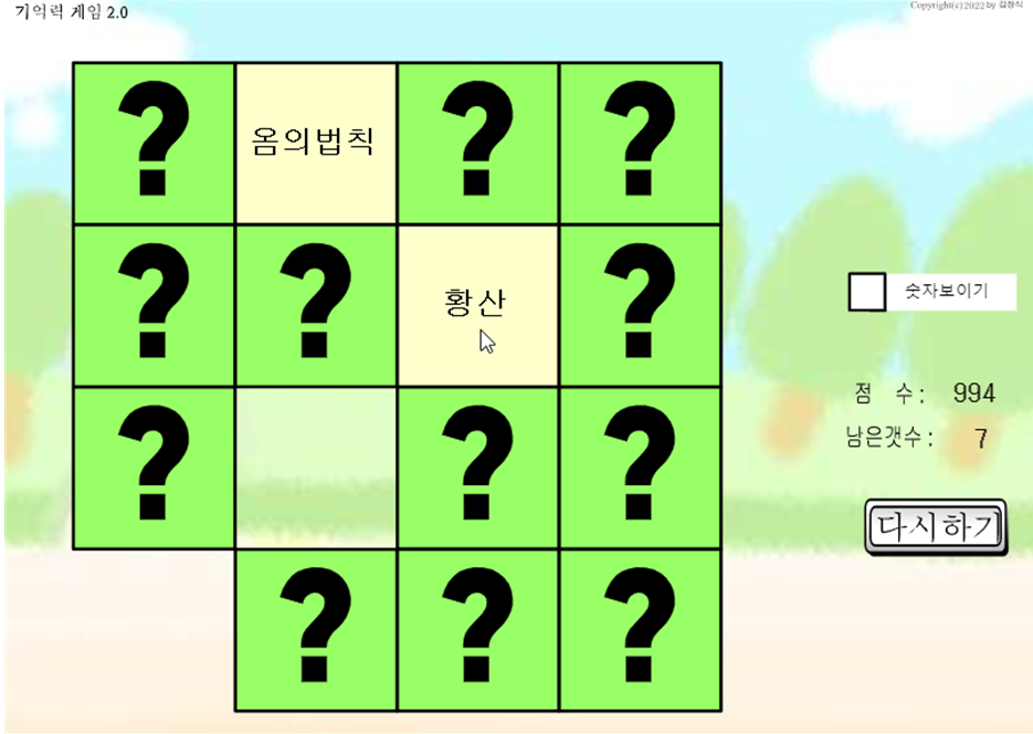 학생들이 좋아하는 기억력 게임(memory game)이다.