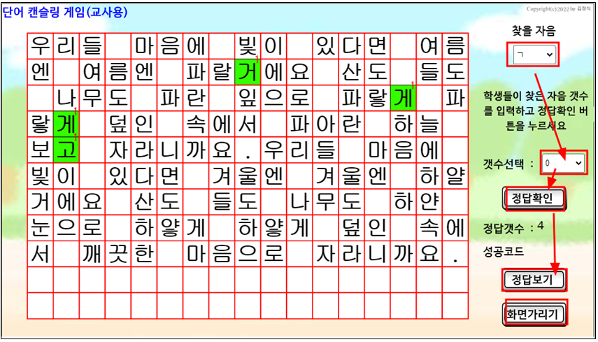학생들에게 중요한 문장을 주고, 문장 중에 제시한 자음의 수를 맞추게 하는 게임이다.