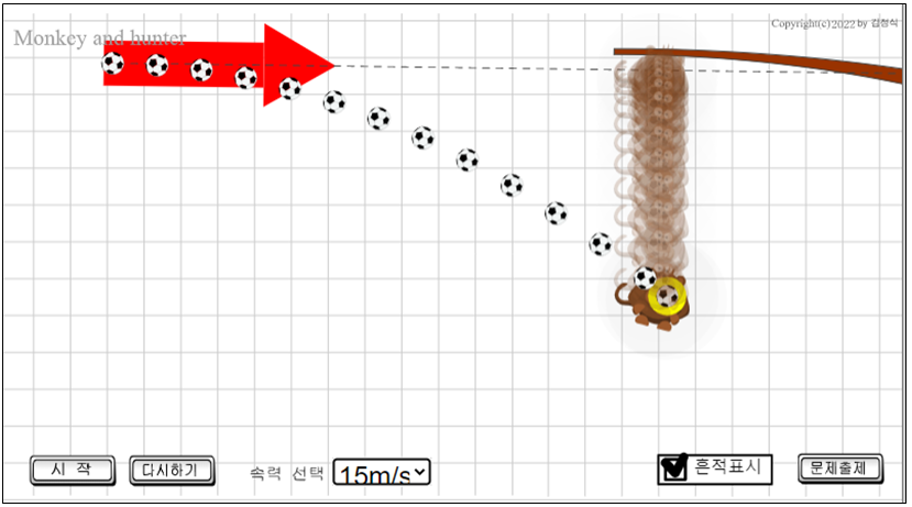 공의 속력이나 위치와 상관 없이 원숭이를 정확하게 겨냥해서 쏘면 공이 원숭이에 맞는 다는 것을 알 수 있다.
