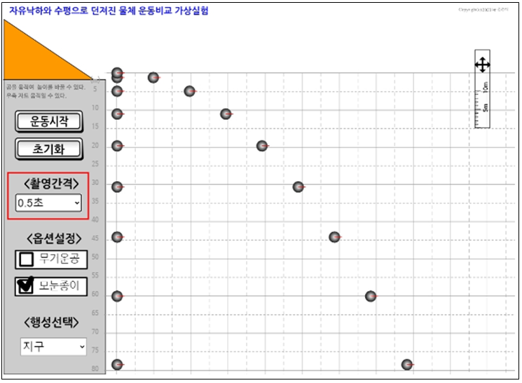 자유낙하와 수평으로 던져진 물체 운동 비교 가상실험은 아래 링크 참고