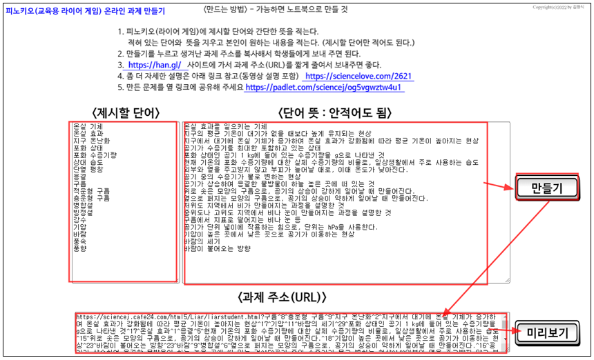 기존에 적혀 있는 단어들을 지우고, 본인이 원한는 단어와 뜻을 적고, 만들기를 눌러 나온 과제 링크 주소를 학생들에게 보내주면 된다. 과제주소가 길면 han.gl 사이트에 가서 짧게 줄여서 보내 주면 된다.