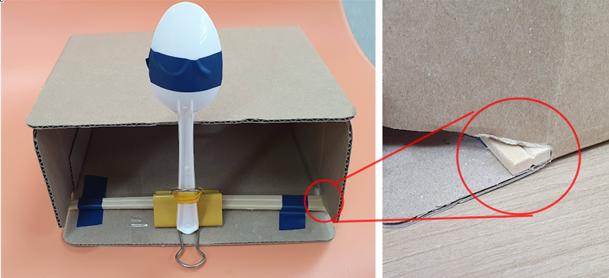 4.택배박스 한쪽면을 접어서 틀을 만들고, 열려 있는 쪽에 숟가락이 연결된 나무젓가락을 끼워 넣는다. 끝까지 넣어야 발사시 흔들리지 않고 고정이 된다. 필요하면 테이프를 이용하여 고정시켜도 좋다.