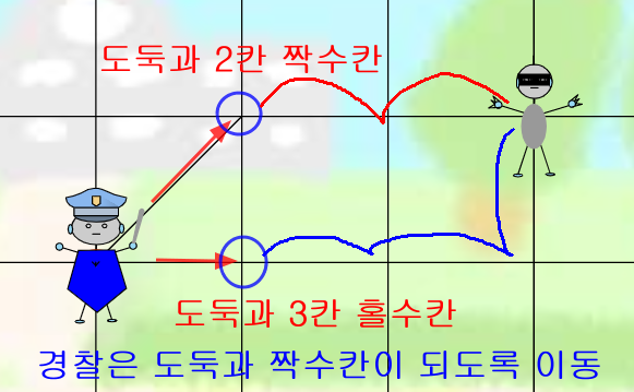 즉 경찰이나 범인이나 자신의 차례에 상대방과 짝수칸이 되는 위치로 말을 옮겨야 이길 수 있다.