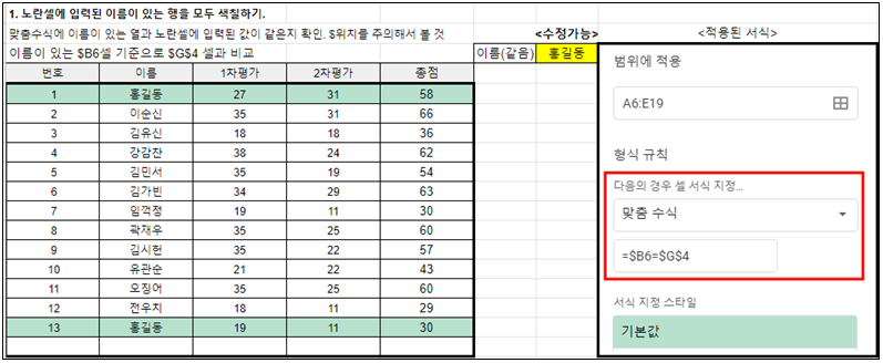 또는 일치하는 문자로 바꾸면 정확하게 이름이 맞는 경우에만 색을 바꿀 수 있다. 찾는 학생이름만 색을 바꾸는게 아니라 찾는 학생이름이 있는 행을 다 바꾸고 싶다면 맞춤수식을 사용해야 한다. 이건 아래쪽에 설명되어 있다.