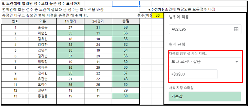 2. 총점이 입력된 점수보다 크면 그 행을 찾아서 모두 색을 바꿔라.