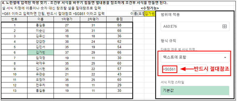 노란색 셀에 이름을 입력하면 범위에서 그 이름이 포함된 셀 색을 바뀌게 하면 된다. 그러려면 형식규칙에서 이름을 직접 입력하는 것이 아니라 이름이 입력된 셀주소를 알려 줘야 한다. 이때 주의할 점이 있다. 노란색 셀이 G61 에 있다면 반드시 형식규칙에는 =$G$61이라고 절대참조로 입력해 줘야 한다. 그럼 지정된 범위에 있는 셀들을 =$G$61 셀과 하나씩 비교해 가면서 일치하는 셀 색을 바꾸게 된다.