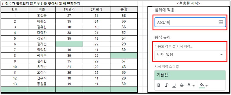 점수가 입력되지 않은 빈칸만 찾아서 셀 색 변환하기