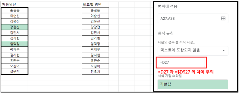 조건부 서식에서 형식규칙을 절대참조로 하지 않고 상대참조로 하면 적용된 범위 셀이 위치를 옮길 때 마다 형식규칙의 셀도 함께 옮겨지게 된다. 따라서 아래와 같이 처음 명단과 비교할 명단이 같은지 다른지를 확인할 수 있다.