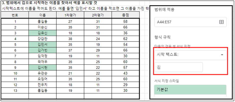 이름을 검색할 필요가 있을 때가 많다. 이런 경우에는 조건부 서식 형식 규칙에서 문자와 관련된 규칙을 사용하면 된다. 시작텍스트를 김 으로 하면 김씨성을 가진 학생들을 찾아 색을 바꿀 수 있다. 시작텍스트에 홍길동을 적으면 홍길동 학생만 색을 바꿀 수 있다.