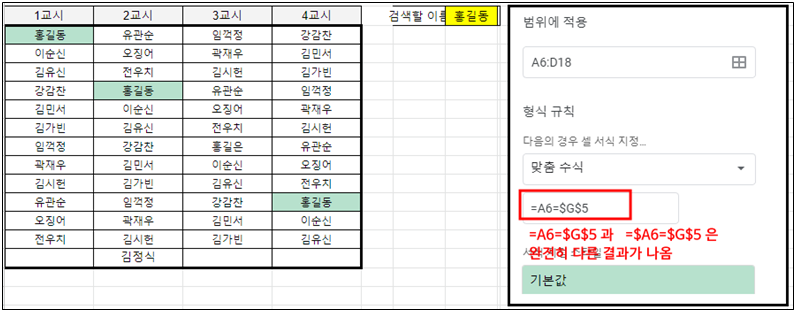 =$B6=$G$4 라고 입력하면 된다. 범위는 A6 부터지만 우리는 이름이 같은 사람을 찾아야 하기 때문에 $A6이 아니라 이름이 있는 =$B6을 입력해야 한다. 이는 이름이 있는 B열을 $G$4에 입력된 이름 값과 비교해 가면서 범위내에서 입력된 이름과 같은 행 색을 모두 변경하라는 의미다.