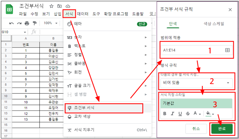 첫 번째는 조건부 서식이 적용될 범위를 선택해 준다.(이게 제일 중요하다. 범위 설정이 제대로 되지 않으면 그 다음 부터는 의미가 없다.) 두 번째는 적용될 서식의 조건을 골라 준다. 마지막으로 세 번째는 어떤 색으로 셀서식을 바꿔 줄건지 설정해 준다. 위 그림처럼 선택하면 A1:E14 범위에 있는 성적표에서 점수가 입력이 안된 셀(비어있는 셀)을 찾아 색을 기본값으로 바꾸라는 조건부 서식이 된다.