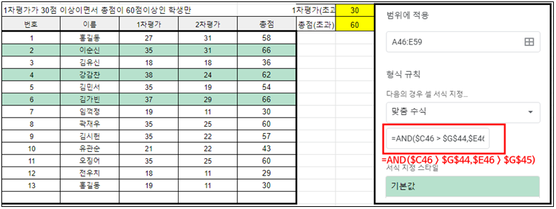 예를 들면 1차평가 점수가 30점 초과 이면서 총점이 60점 초과인 학생의 색을 바꾸는 경우 맞춤수식에
