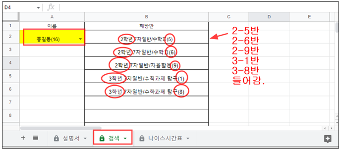 검색창에 노란색 칸에 선생님 이름을 선택하면 그 선생님이 들어가는 반이 순서대로 나타난다.