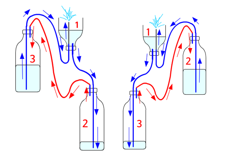 1번 분수에 물을 부으면, 수압차에 의해 1번 분수에 있던 물이 2번 페트병으로 흘러 내려간다. 그럼 2번 병에 있는 공기가 압력이 커져서 적색 연결관을 따라 3번 페트병으로 이동하게 된다. 3번 페트병에 공기가 이동해 오면 기압이 커지게 되고, 증가된 기압은 3번 페트병에 있는 물을 파란색관을 통해 1번 분수관으로 밀어올리게 된다. 그럼 1번 분수에서 물이 나온다. 뿜어져 나와 고인물은 다시 2번 페트병으로 흘러 내려가면서 같은 작용이 반복되면서 계속해서 분수가 나오게 된다.