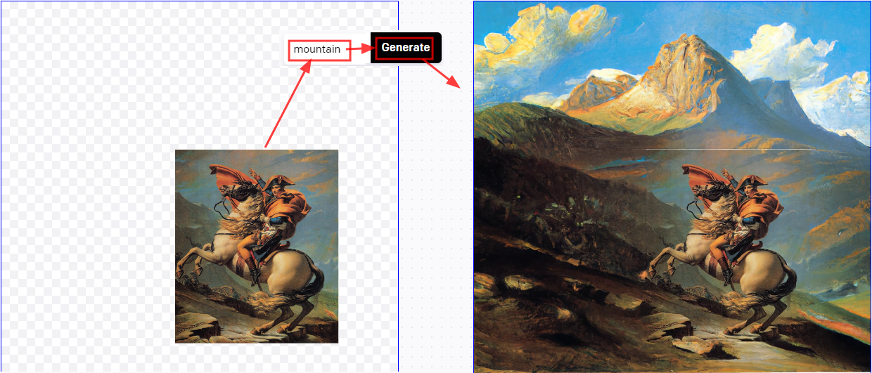 위 2번째 사진에서 edit를 누르고 들어와 아래 메뉴에서 프레임 추가를 눌러 확장될 곳(여기에서는 그림 위쪽)에 프레임을 추가했다. 그림 위쪽에 비행기가 날아다니면 좋을 듯 하여, 문장으로 airplain을 추가하고 Generate를 눌렀더니, 이미 만들어진 그림과 연결지어서 그림 위쪽에 비행기를 그려 준다. 그려진 비행기 종류는 화면 중앙에 나타난 메뉴에서 좌우 화살표를 이용해 다른 비행기 그림으로 바꿔 볼 수 있다.