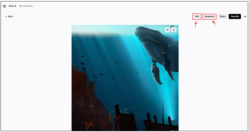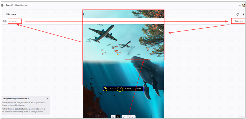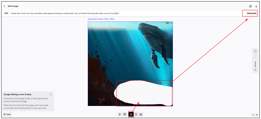 5) 위 2)번 과정에서 Variations 대신 그림에서 EDIT를 누르면 그림의 일부를 수정할 수 있다. 이미지 편집은 현재 베타 버전이라 추후에 변경될 가능성이 있다고 한다. 편집할 이미지의 일부를 지우거나 생성 프레임을 추가하여 이미지를 확장할 수도 있다.