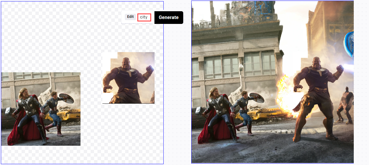 어벤져스 사진 2장을 올리고 나머지 부분은 인공지능에게 그리게 하였다.