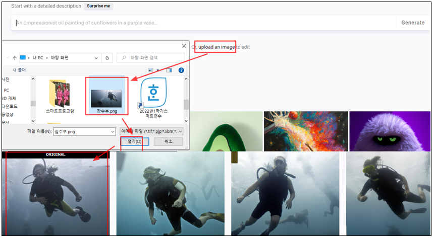 7) 첫화면에서 문장을 입력하지 않고 그림을 업로드 하면, 인공지능이 그 그림을 자동으로 변형시켜 새로운 그림을 만들어 준다.