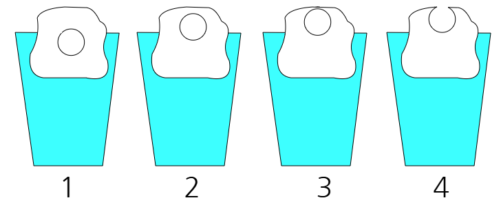 1번이나 2번은 얼음 한쪽에 구멍을 뚫어도 얼음이 잠긴 정도는 변하지 않는다. 따라서 얼음이 다 녹아도 수면의 높이는 변화가 없다. 얼음 안쪽에 있는 공기나 물이 한쪽 표면으로 이동해서 얼음 표면에서 안쪽으로 구멍이 생기는 순간 얼음이 더 뜨거나 가라앉을 이유가 없기 때문이다. 어차피 구멍을 통해 공기가 있던 자리에 공기가 들어오거나 물이 있던 자리에 물이 들어와도 얼음의 무게나 부력이 변하지 않는다.