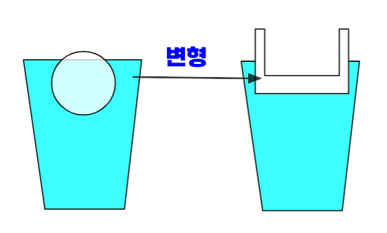 얼음의 양이 같다고 했을 때 1,2,3,4 번 컵의 얼음이 녹아도 수면 높이는 변하지 않는다.